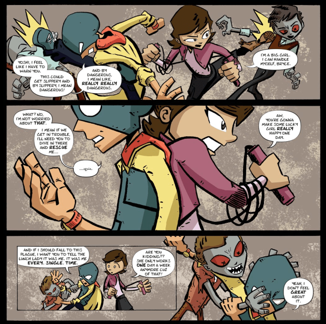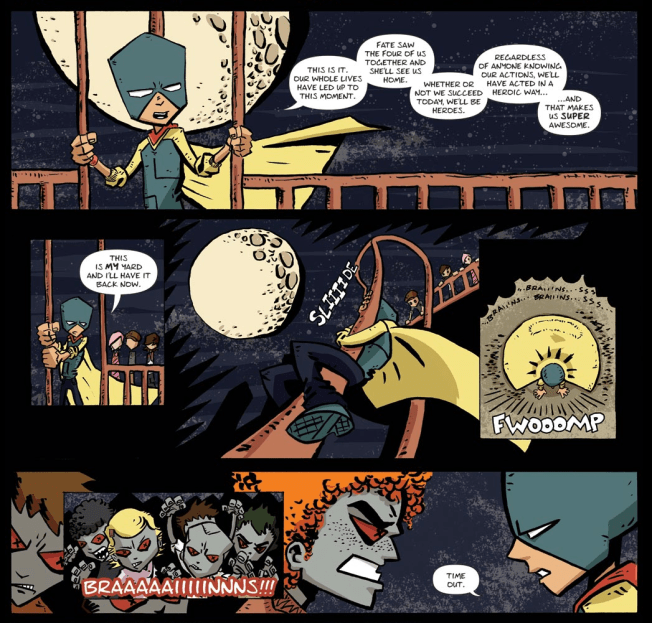 The story itself is fantastic; involving a “superhero” who faces off against Zombies, Pirates and… well, girls and bullies. It may all sound somewhat mundane, yet it is all done with such a diligent sincerity and is so expertly crafted that you’re sold on the old standbys almost immediately. The writing is absolutely great: clever plotting, razor-sharp, witty dialog and a fantastic sense of place which takes the banality of ordinary settings and very convincingly makes them extraordinary. The layouts are clever as well, containing some very nice, unique paneling while still retaining a cohesive flow.