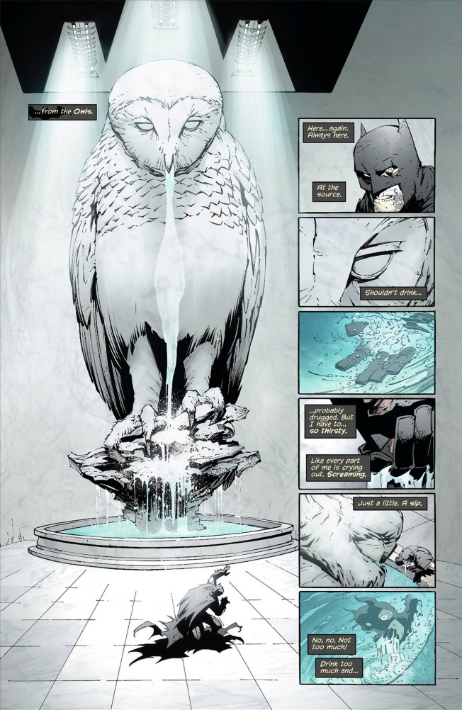 Finally though, we leave batman on another big splash page where he is being stabbed by Talon, right through the gut. It’s old hat by now in this arc to end on Batman seemingly being killed, so why in god’s name should it be considered intriguing or a viable hook to do it yet again? It’s obviously a necessary cop-out conclusion to the non-story that preceded it. Of course, we know it’s a hallucination (Batman’s hands are not owl talons) so really, nothing at all has happened within the bulk of the pages contained in this issue. Batman wandered around and muttered to himself… best script of Snyder’s career?