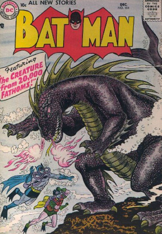 For a Golden Age cover this is pretty detailed and shows a great sense of scale and bombast, I know I would have flipped my shit if I had seen this sitting on a counter when I was 6… and it was 1956.  Batman looks to be fighting the Babonga (the giant fucking sea monster) – but in the story he is actually trying to save it.