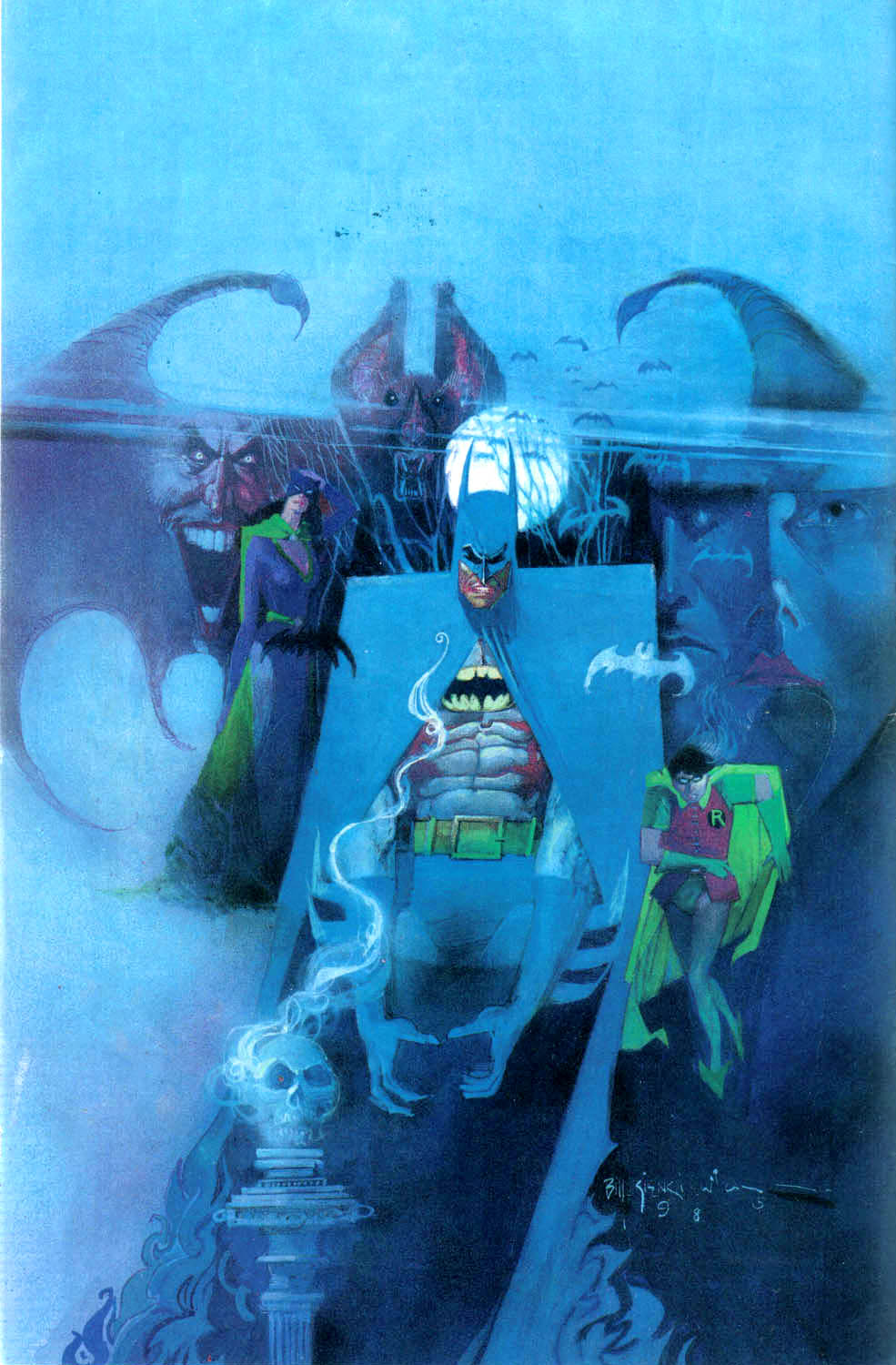 This cover has always reminded me, of Dave Mckean’s work on Arkham Asylum: A Serious House on Serious Earth; the lithe, gesticulating batman, the mad, expressionist portrayal of the Joker, the random faces, bats, the moon, shadows, a skull – all archetypal building blocks of a grand and morbid visual trip. I loved it then and I love it now.