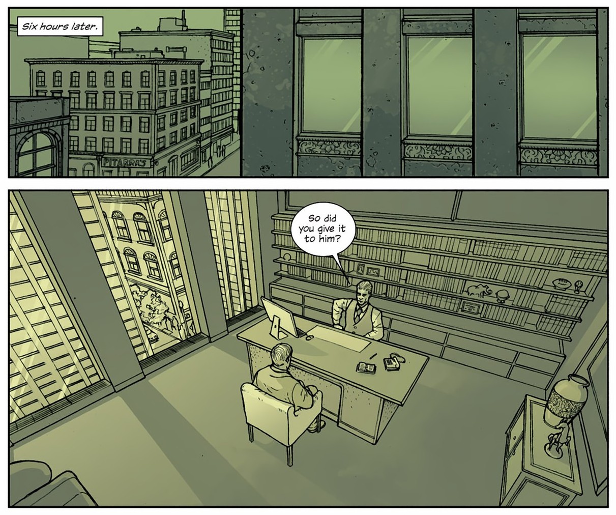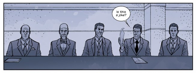 That love-child parenthetical aside from above– well that’s only half jest, because while reading Secret I really did find the dialog and plotting to be very Chayefskian and the characters to be hopelessly Thompsian – but rest assured, this is a compliment of the highest order in my mind. For a crime and espionage story to be presented and told so well in a comic book is a bit of a revelation for me. The giant in the genre, Brubaker, is great… but all too often I feel oppressed by his strict, almost fetishistic, adherence to classical noir (and therein its myriad of tropes), whereas Secret feels stirringly relevant. Perhaps it’s the corporate espionage and technology angles in the story, but more to the point, I think it’s the pace, the tenor of the tale that warms me up like Brubaker mostly doesn’t. It still seems to be a precise and fully realized story of damned souls working their ways through a crooked and dying world of avarice and compulsion, yet Secret is more firmly rooted in contemporary milieus than Brubaker’s signature nostalgia for the bygone eras, which tends to inform his (Brubaker’s) story structures a bit too much for my taste – however, Hickman’s pacing is more energetic, even though this book is comprised of mostly long expositional conversations I still found myself rapt with attention because the dialog was so captivating and the speech patterns worked to keep the plot flowing at a brisk pace.