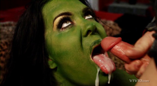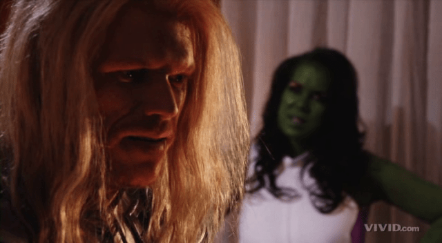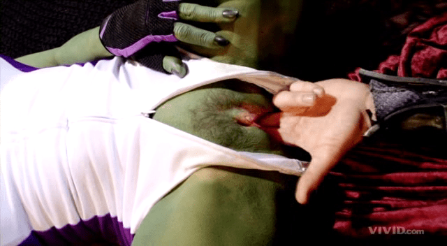 Chynna’s sex scene with Thor was boring and uninspired. But the thing that bothered me the most was HOW BAD THE GREEN BODY PAINT LOOKED!!! Her body and face looked badly blotched and streaked like the make-up artists just literally splashed the shit on with a paint roller. And Chynna doesn’t show her green tits or ass. She has the same mechanism in her costume that allows the crotch to open so she can have vaginal sex. My assumption is that the body paint started to smear and streak so badly that the decision was made to keep her top on. In fact, during close-ups of the hardcore penetration…you actually SEE that some of the green paint has rubbed off her pussy and onto the bottom of her costume…YUCH!! (Use your own imagination to guess what THIS looks like!!!)