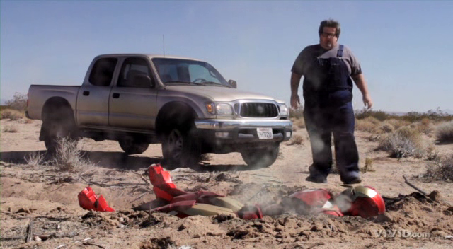 A fat hillbilly pulls up in a truck, looks at the downed Stark and is asked to call S.H.I.E.L.D. – yeah, Tony, I’m sure this fat hick knows how to get a hold of the super secret spy agency… why not give them a call yourself with that fancy suit of yours?