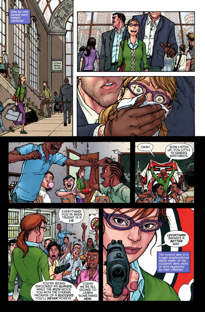 For the record, the scene is nowhere close to recalling the Aurora tragedy and if it wasn’t for DC publicly making the connection themselves no one would have linked the two in any way. The scene in question is literally two panels long and over by the time you turn the first page. Within the scene in question, a teacher who has come under the sway of Leviathan’s mind control drug pulls a gun on a class of young students and militantly preaches Leviathan’s coarse, base ideology.