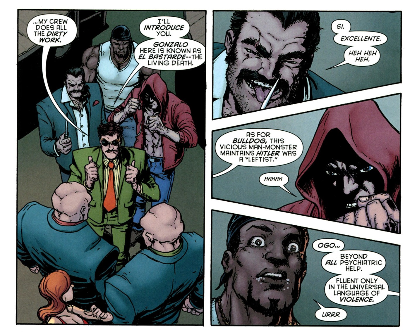 Our “Dead Heroes Club” make their first appearances in their new identities; The Hood, El Gaucho and Batwing all playing their new roles. However, since I’m sure Talia is aware of Bruce’s “Matches” persona, it seems that it would be fairly obvious to her that these new compatriots are indeed Bruce’s Batman Incorporated agents – who just recently all “died” (a point Damian later brings up once his new persona is revealed). As such, I’m not entirely clear what Morrison is trying to represent Bruce’s motivations to be here – yet I’m certain it will be revealed as we progress through the series’ arc.
