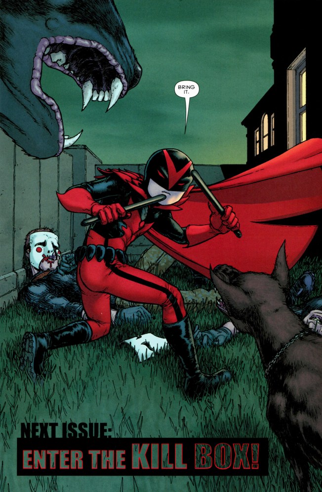 As Bruce follows up the leads from Goatboy he receives a call from the mysterious “Lumina” (the singer from the nightclub) and is then led into a Leviathan trap. Goatboy needs a third sacrifice and Matches is the perfect candidate for him. As Bruce/Matches is about to be executed by “Jack Ketch“, Damian has escaped from the protective custody of the Batcave and revealed to us his new “Dead Heroes” identity: Redbird. Damian assumed Bruce was walking into a trap of Talia’s design so, of course, he takes it upon himself to find and rescue him if need be.