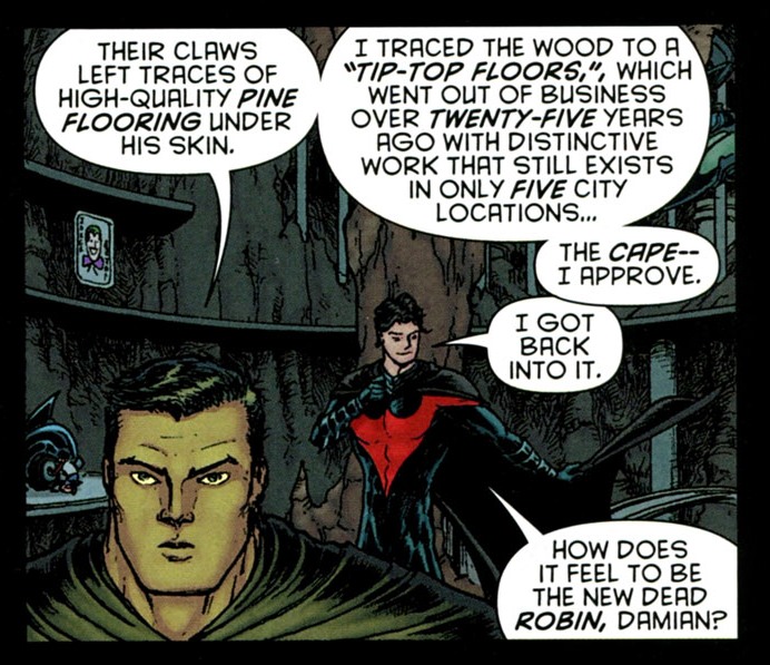 We also find that Damian was dead serious about keeping Bat-cow and that the drugs used on the cattle are derived from Professor Pyg’s peculiar compounds. Interesting, in that Pyg was part and parcel of Dr. Hurt’s plan, not Talia’s, so obviously Talia had some more concrete connection with Hurt and the Black Glove than previously assumed. Either that or she had infiltrated them as well, unbeknownst to them.
