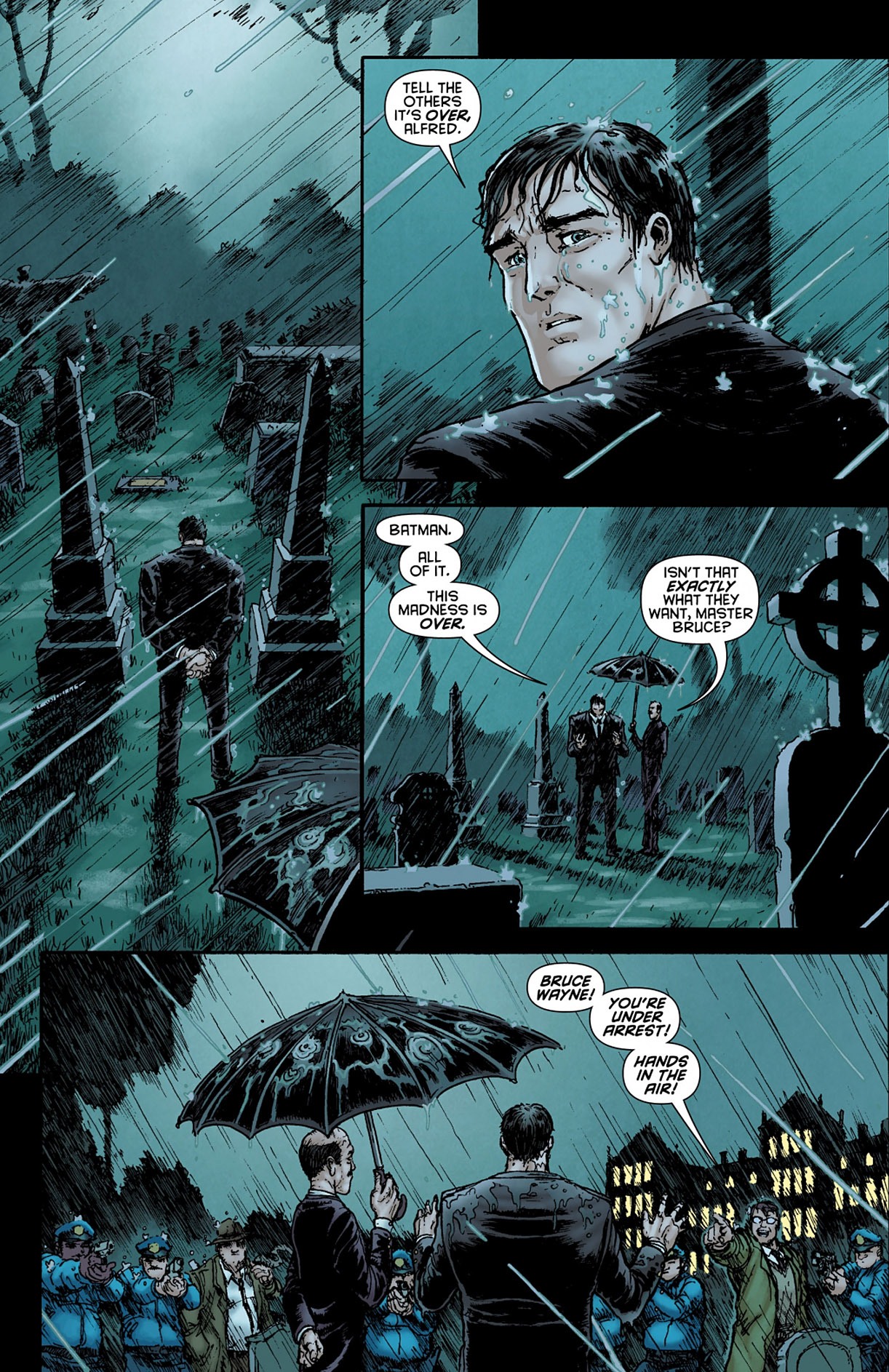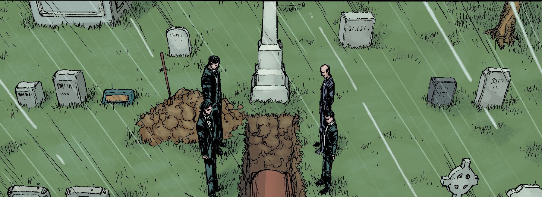 Elsewhere, Bruce and family hold a private funeral, to bury Damian and, upon first glance, I assumed this was the wrap-around from the very first scene of volume 2 as seen below: