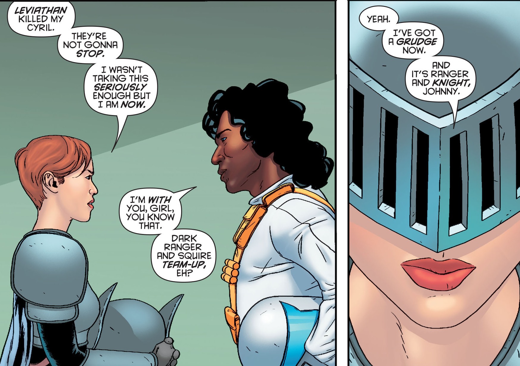 This was a fantastic issue filled with a myriad of plot points which were compellingly structured and full of emotional impact. The entire issue flashes backwards, forwards and ends in the present. We get a few questions answered, a few more raised and we even see the triumphant re-conviction of the always enjoyable, Squire who decides to now take up the mantle of The Knight.