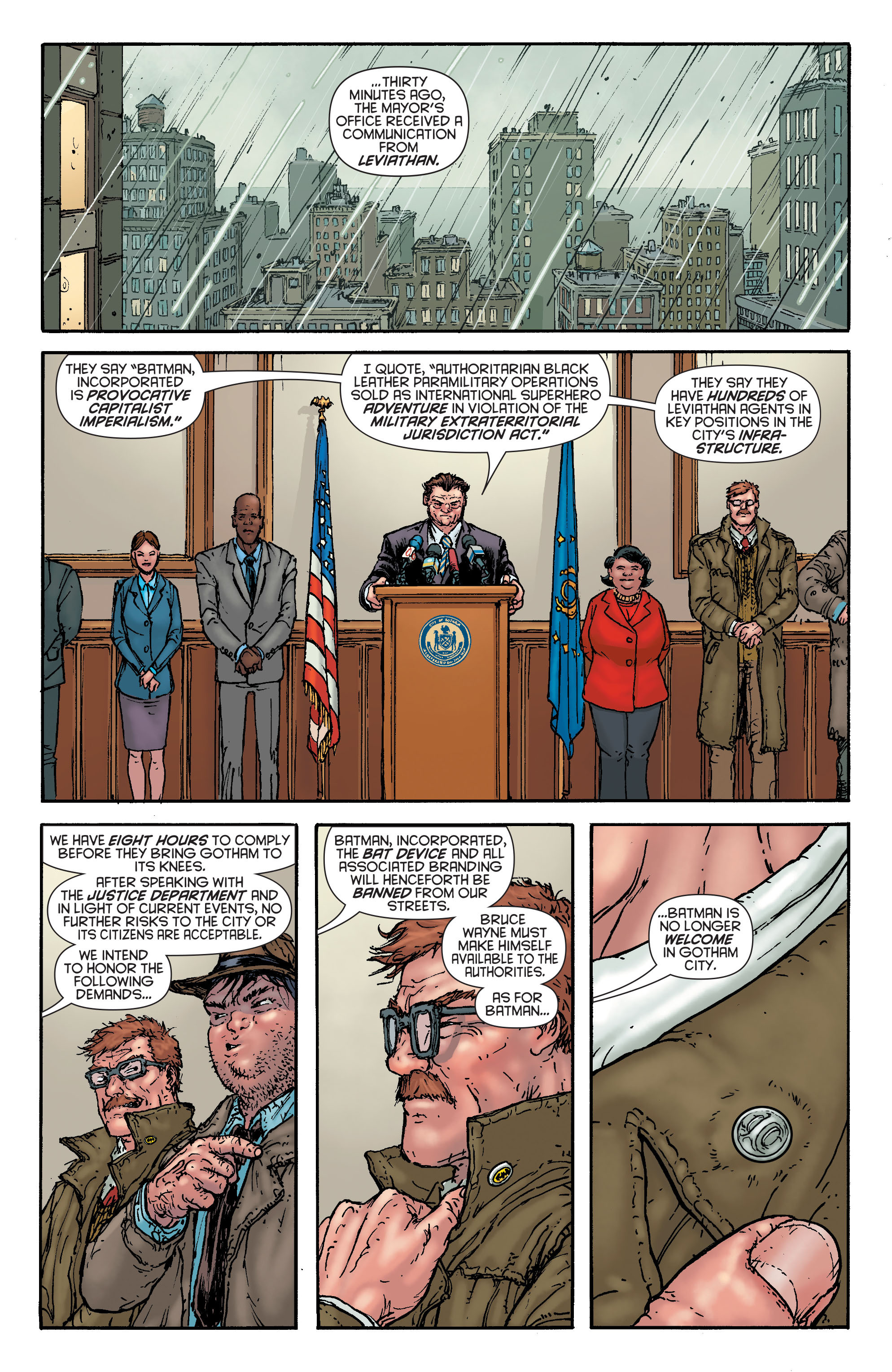 We also learn that Leviathan is still holding Gotham City hostage and the local Government officially labels Batman as a criminal, as such the entirety of Batman Inc. goes dark.