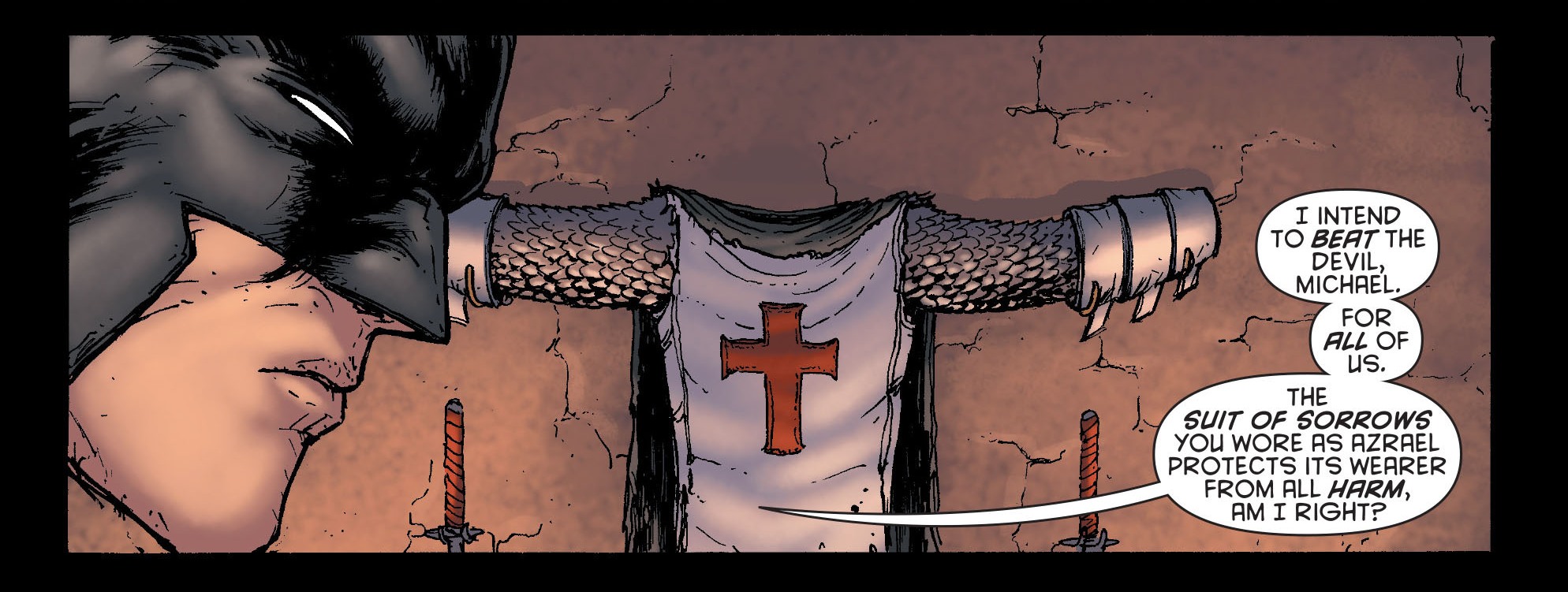 Yet also, Bruce has decided to use a form of the man-Bat serum on himself… in a clever nod to the defining line of the Batman mythos “… Yes, father, I shall become a bat.” Morrison has taken the character to its logical extreme here, literally turning Bruce into a Bat –  if Zur en Arrh Batman is Batman minus Bruce, then Man-Bat Batman is Batman without any humanity at all; a literal animal, hell-bent on a singular mission to defeat the devil by taking all of his own human weakness out of the equation entirely. Add to this that he has equipped himself with an armored battle suit and Azrael’s suit of sorrows – and, well, you have an unstoppable beast that is headed right for Talia… and is royally pissed off.