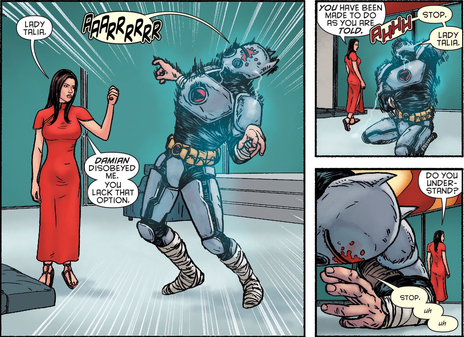 Talia seems to show a slight tinge of remorse now and then when speaking of Damian’s death, going so far as to kill the henchmen who shot at Damian during his fight with the Heretic. She even takes a bit of aggression out on the Heretic himself, perhaps projecting a bit of her own self-hate onto him; punishing him for Damian’s death as a proxy for punishing herself.
